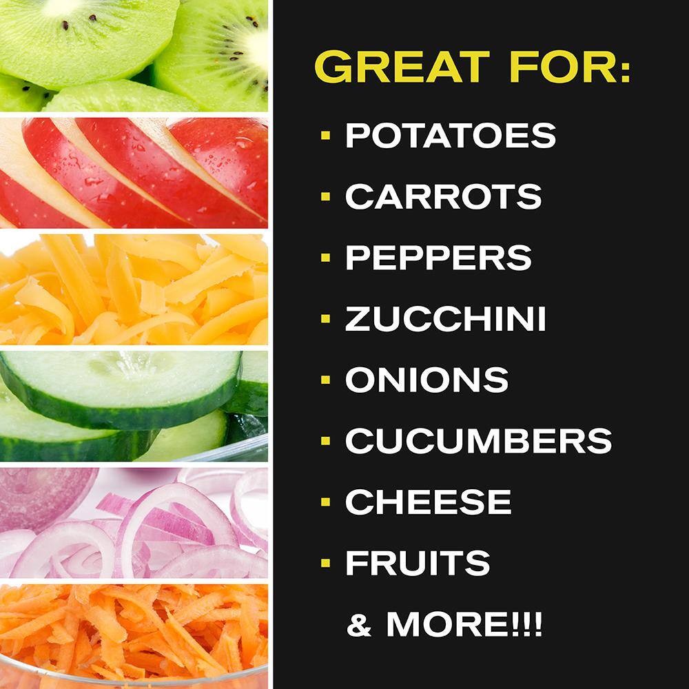 5 different interchangeable slicing options: thick slices, thin slices, wedges, dice and more