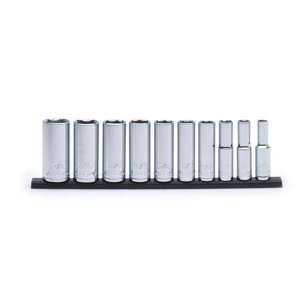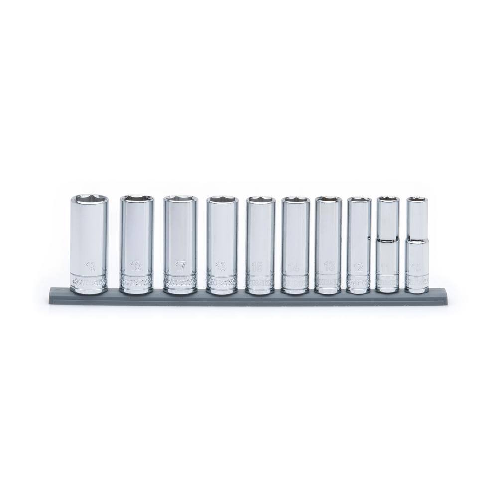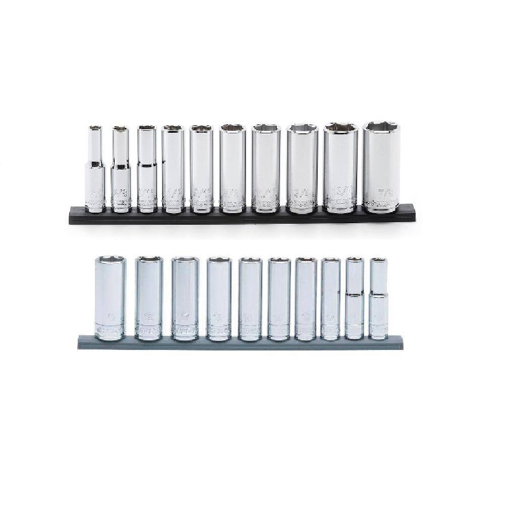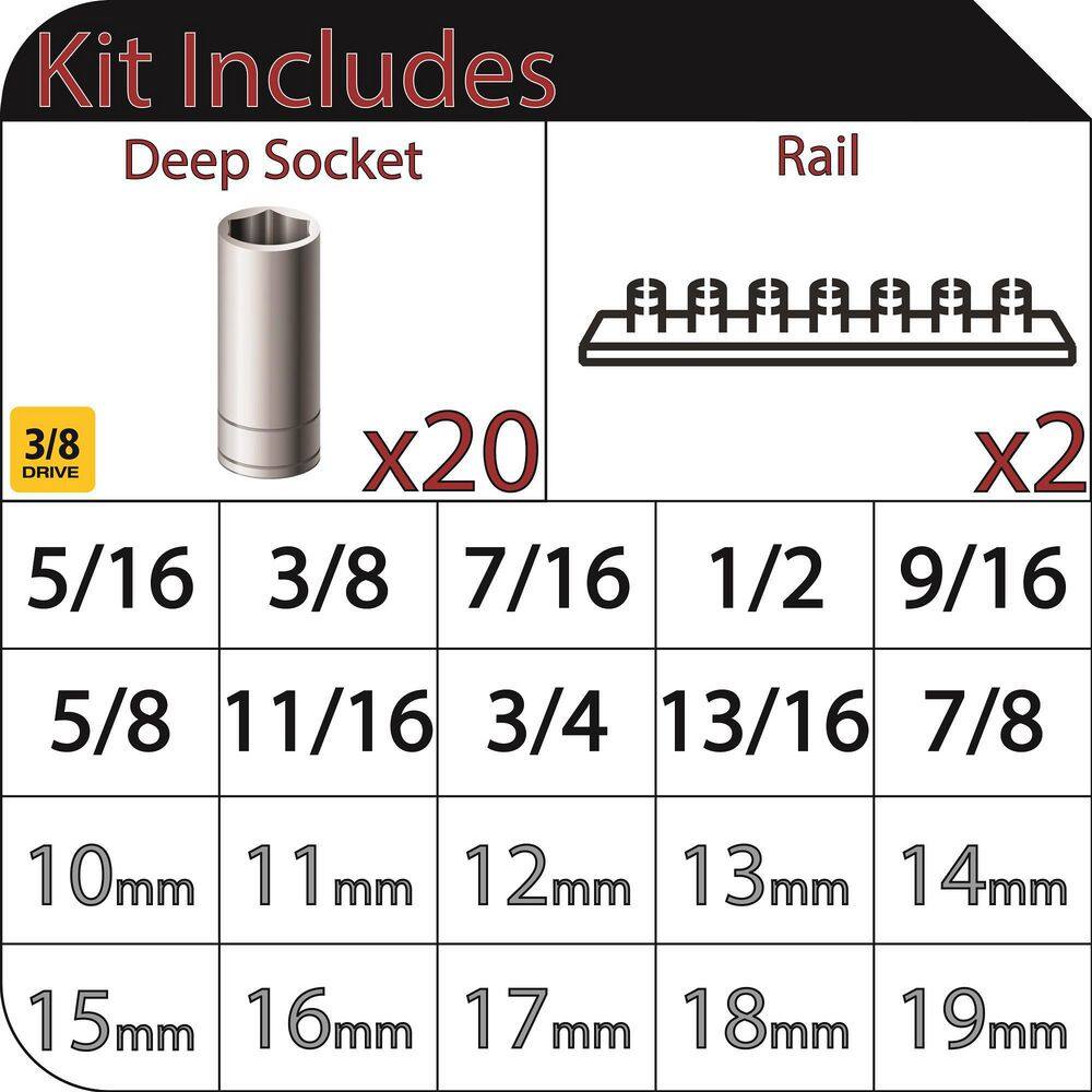Set includes twenty 3/8 in. drive 6-point sockets: 5/16 in., 3/8 in., 7/16 in., 1/2 in., 9/16 in., 5/8 in., 11/16 in., 3/4 in., 13/16 in., 7/8 in. and 10 mm, 11 mm, 12 mm, 13 mm, 14 mm, 15 mm, 16 mm, 17 mm, 18 mm, 19 mm