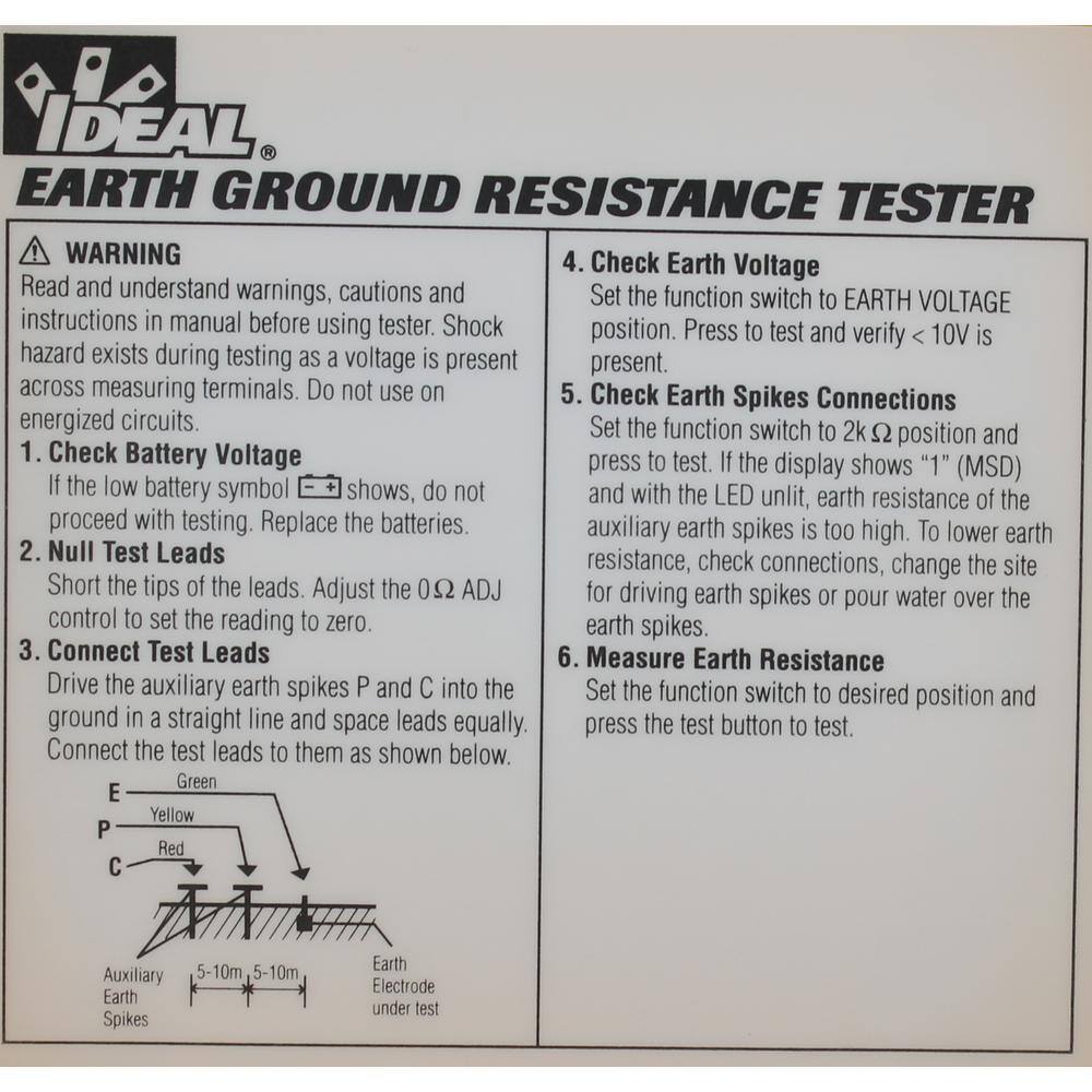 The Ideal Earth Ground Tester provides fast, accurate ground rod testing. Tester uses 2 or 3 pole test methods depending on your application. Includes two 105 ft. and one 3 ft. test leads, 2 T handle test electrodes and case.