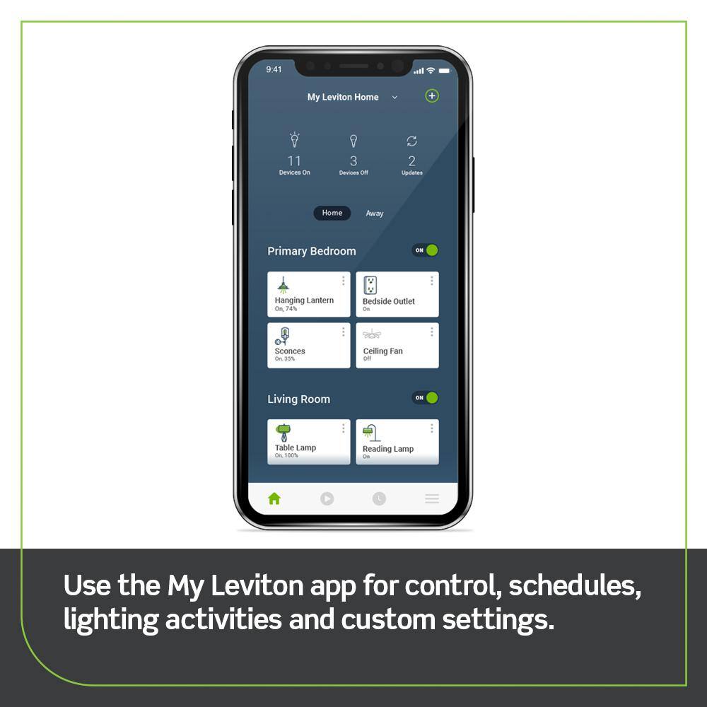 Lighting control: full range dimming with custom settings for preset light levels, fade rates and bulb types, easily create schedules to match your lifestyle with the my Leviton app