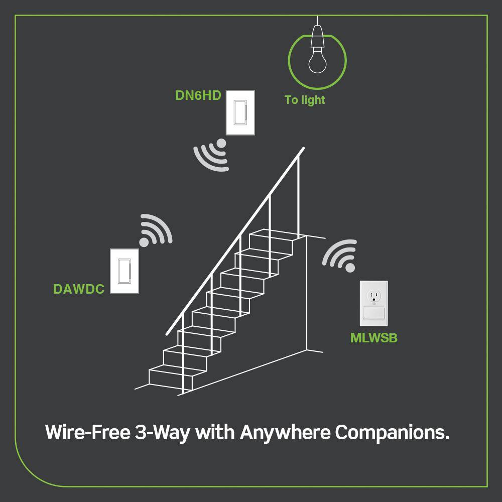Supports wire-free 3-way: add wireless multi-location control when paired with optional anywhere dimmer companion (DAWDC) or anywhere switch companion (DAWSC)