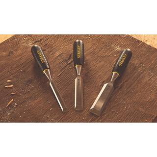The Stanley 3-piece wood chisel set features carbon-steel blades for strength and durability. Blades are hardened and tempered for edge retention and re-sharpening. The durable and ergonomic polypropylene handle is designed for comfort with contoured grooves to aid grip and slip resistance. Set includes 1/2 in., 3/4 in. and 1 in. chisels.