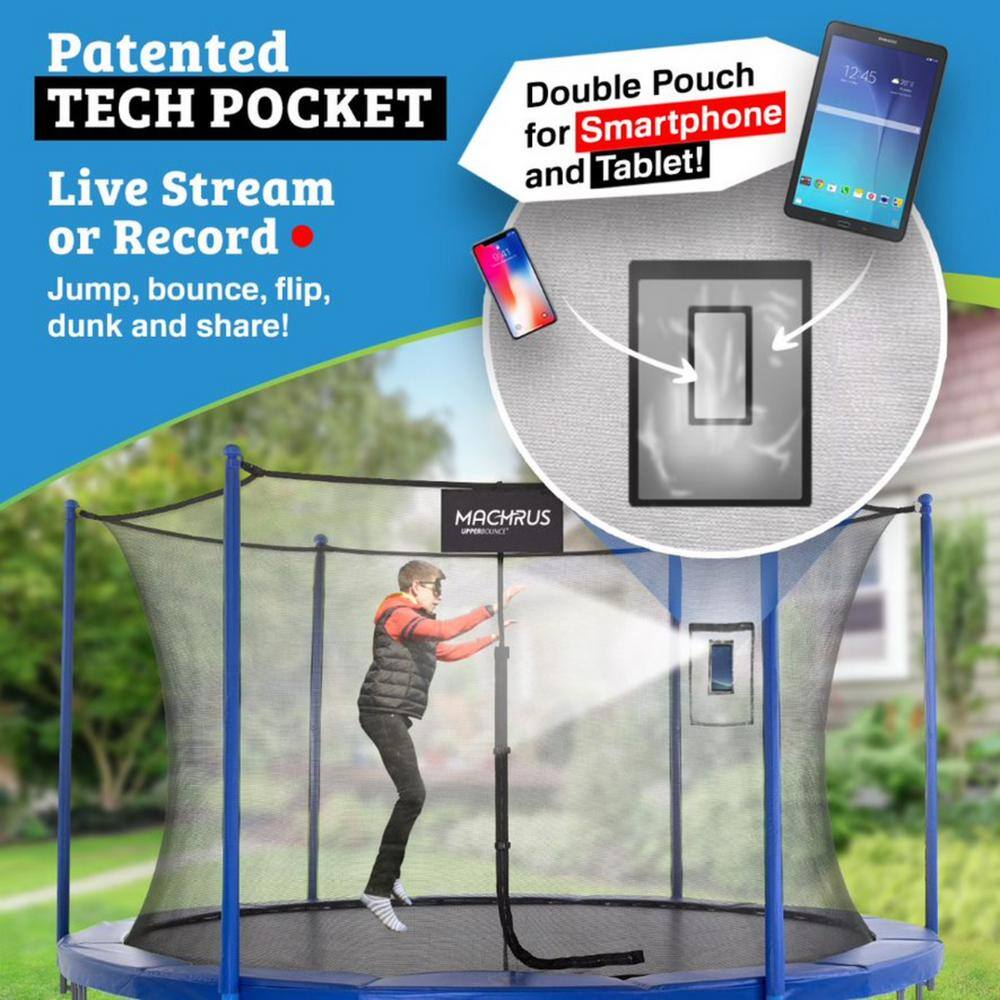 Patented technology pocket the net is equipped with a double tech pocket and transparent window for smartphones and tablets, video-record your jumps and flips or live-stream them to your friends and family without the need of a personal camera crew