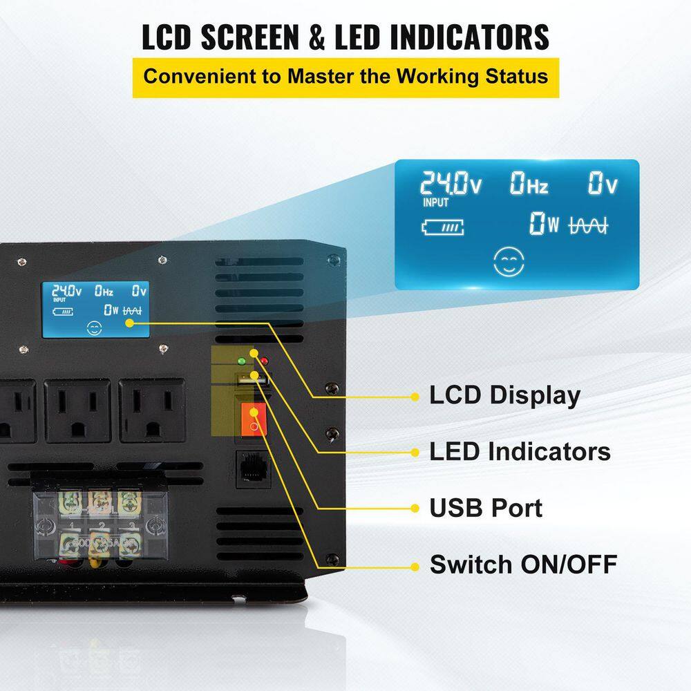 Specifications:Continuous Output Power: 3500 Watt,Peak/Surge Power: 7000 Watt,DC Input Voltage: DC24-Volt(19 to 31-Volt),AC Output Voltage: 120-Volt AC ± 5%,Output Waveform: Pure Sine Wave,Features: LCD Display,Outlet Type: 4 x US Outlets,Cooling Mode: Intelligent Fan Cooling,No Load Current: Less than 1.2 Amp