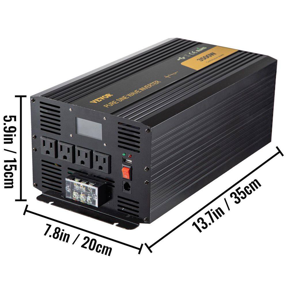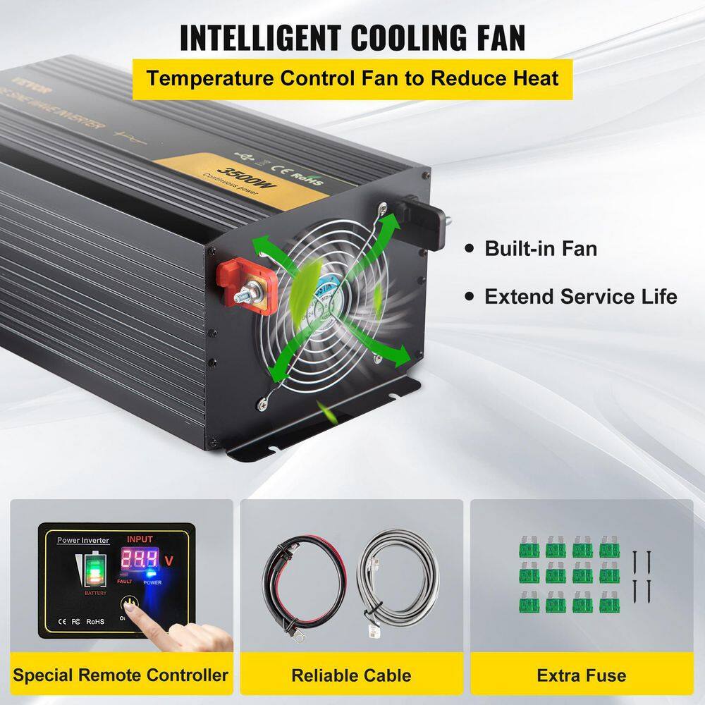 Pure Sine Wave Inverter: Continuous Output Power: 3500 Watt, Peak Power: 7000 Watt, Input Voltage: 24-Volt DC, Output Voltage: 120-Volt AC, Frequency: 60Hz. Pure sine wave inverter adopts an aluminum alloy shell to be weatherable and non-corrosion. LCD screen and LED indicators are convenient for users to master the power inverter working promptly